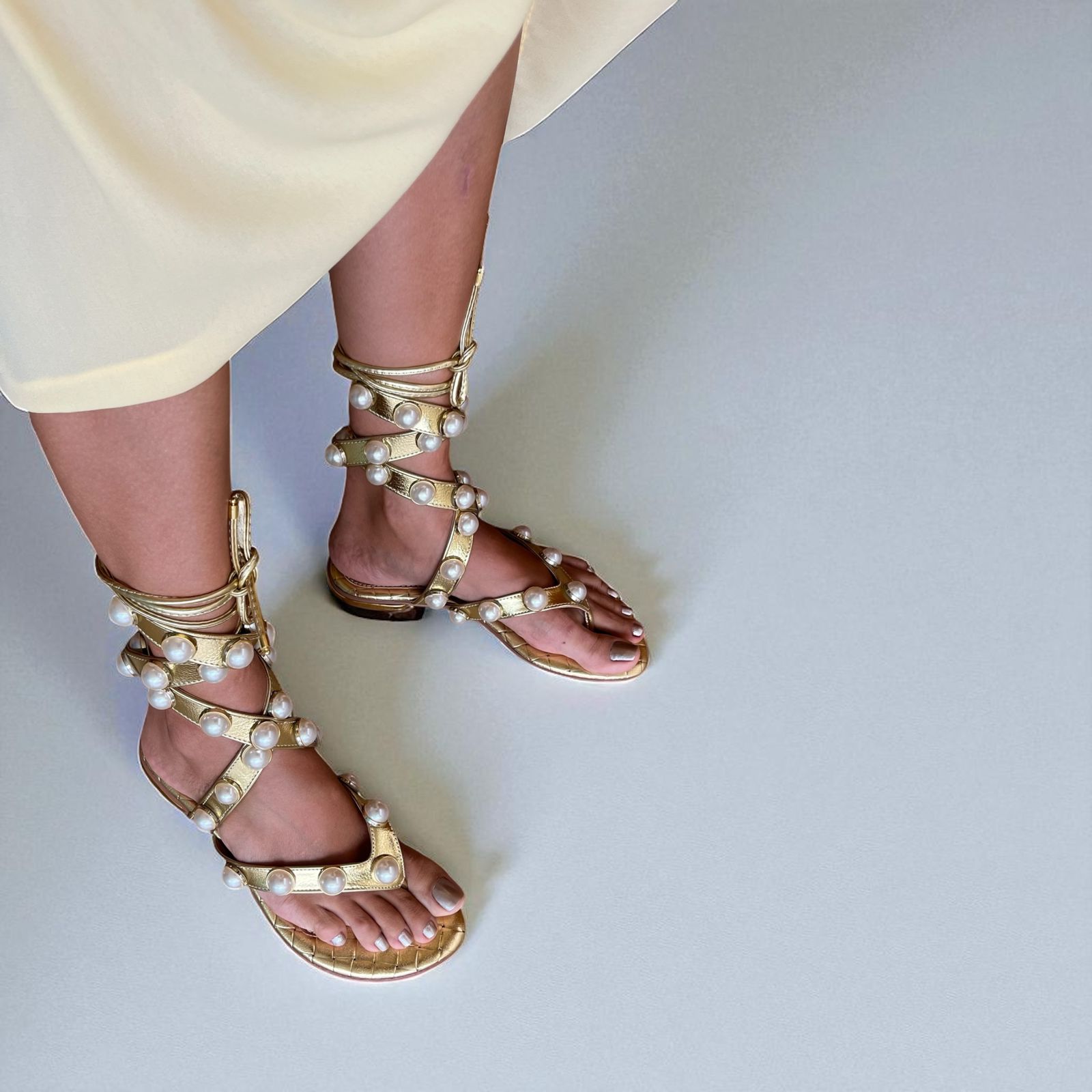 Rasteira bico redondo com palmilha em couro e cabedal em napa com pérolas em acrílico.