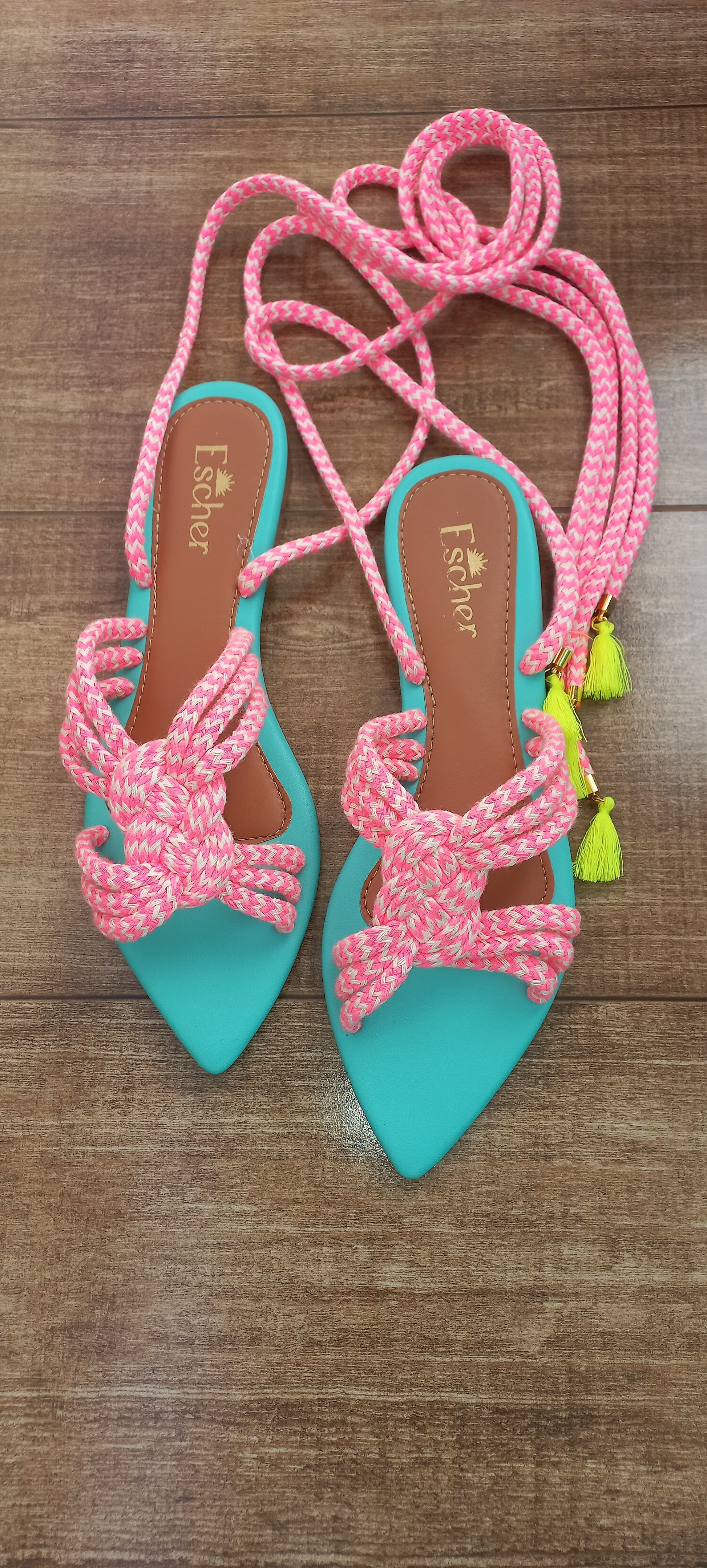 Rasteira com palmilha em napa e cabedal feito de cordão 100% algodão.
