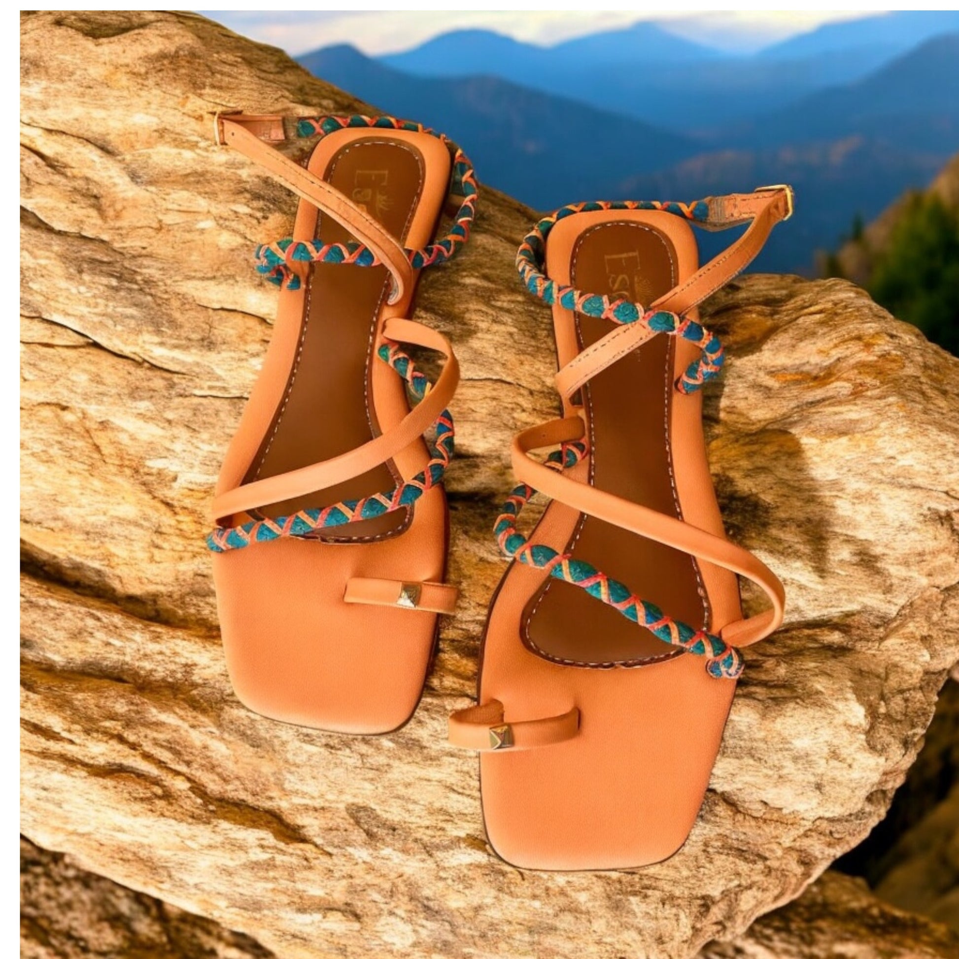 Rasteira bico quadrado com cabedal de napa salmão e cordão de algodão colorido .