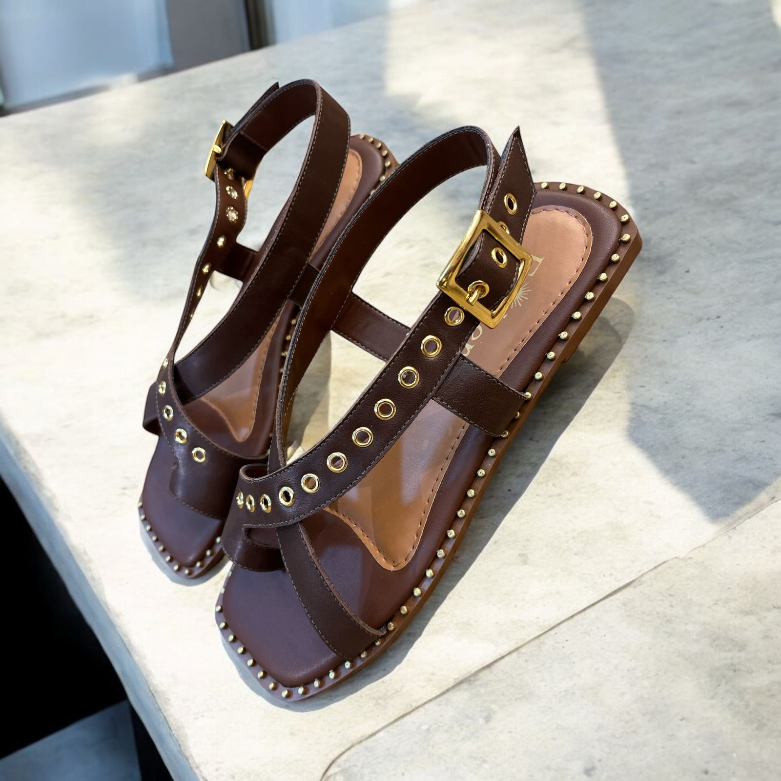 Rasteira bico quadrado com palmilha em napa com cabedal feito em couro com ilhós em metal !