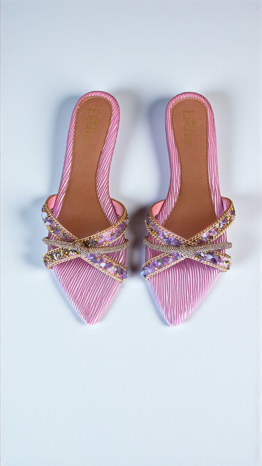 Rasteira bico folha com palmilha em couro com manta em pedras naturais e tira de strass.