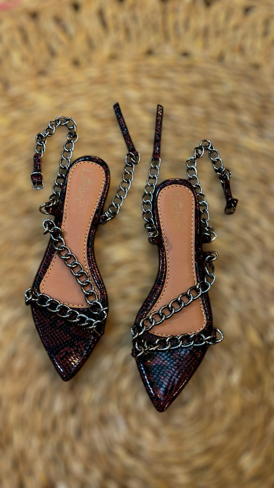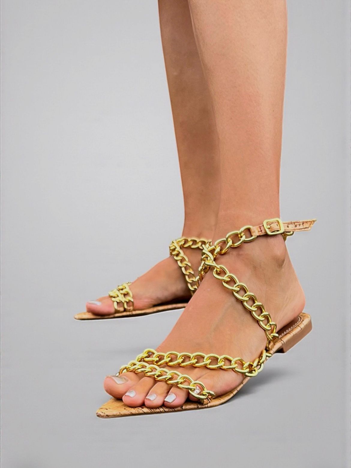 Rasteira bico folha com palmilha em napa croco com dourado e cabedal feito em corrente de metal dourada!