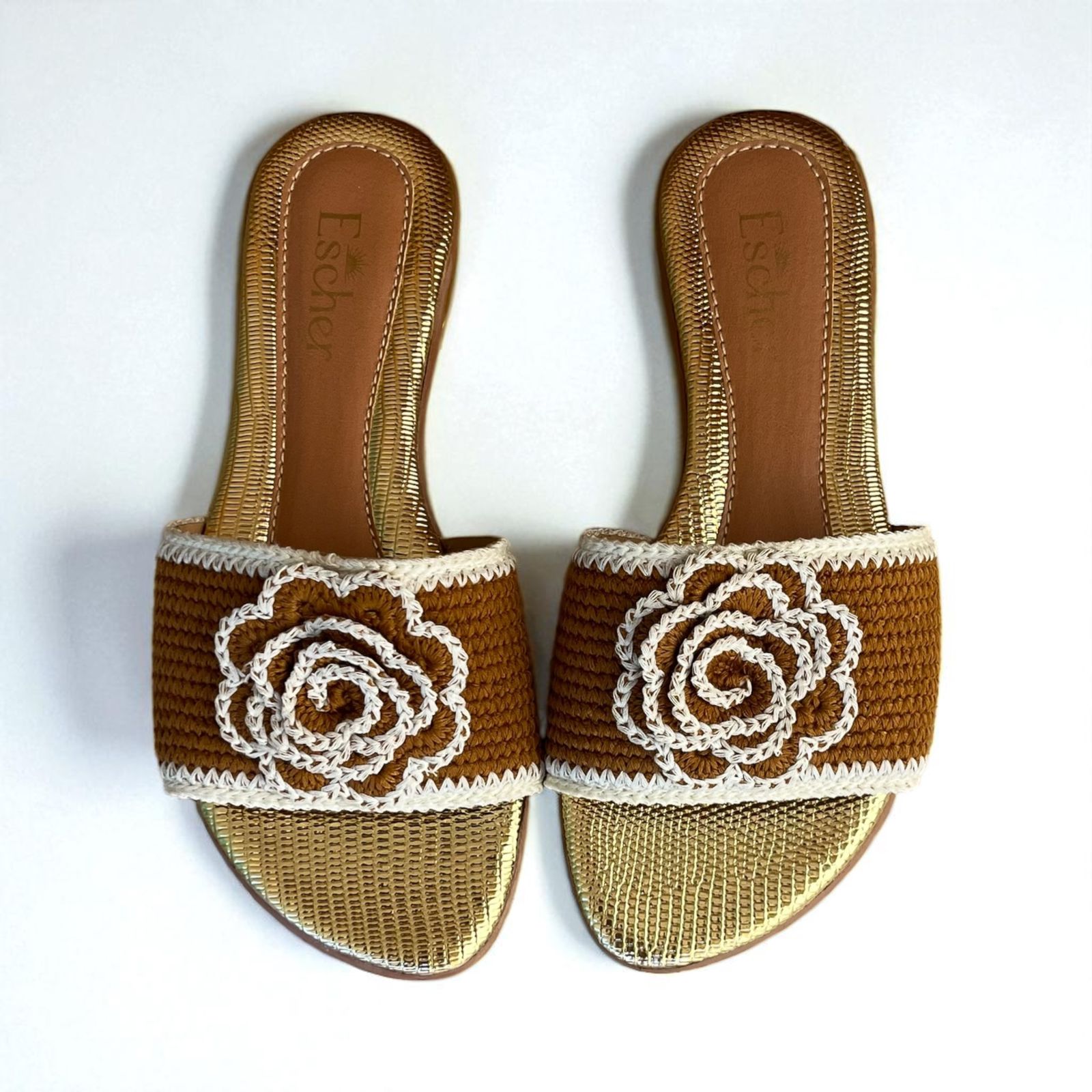 Rasteira bico redondo com palmilha em napa e cabedal em trabalho artesanal em crochê