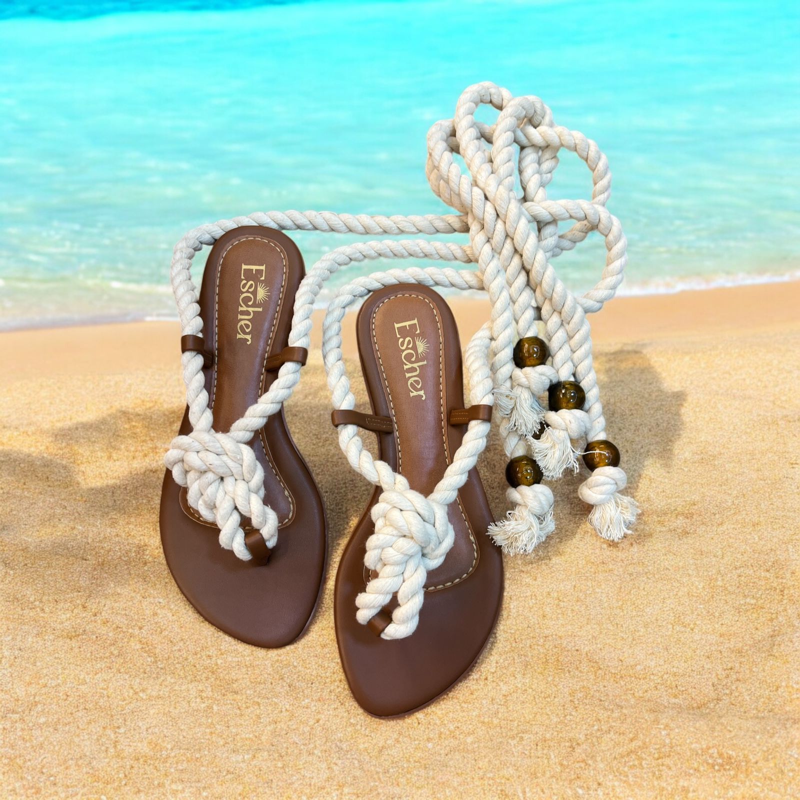 Rasteira bico redondo com palmilha em napa caramelo, cabedal de cordão 100% algodão e bolas de acrílico nas pontas.