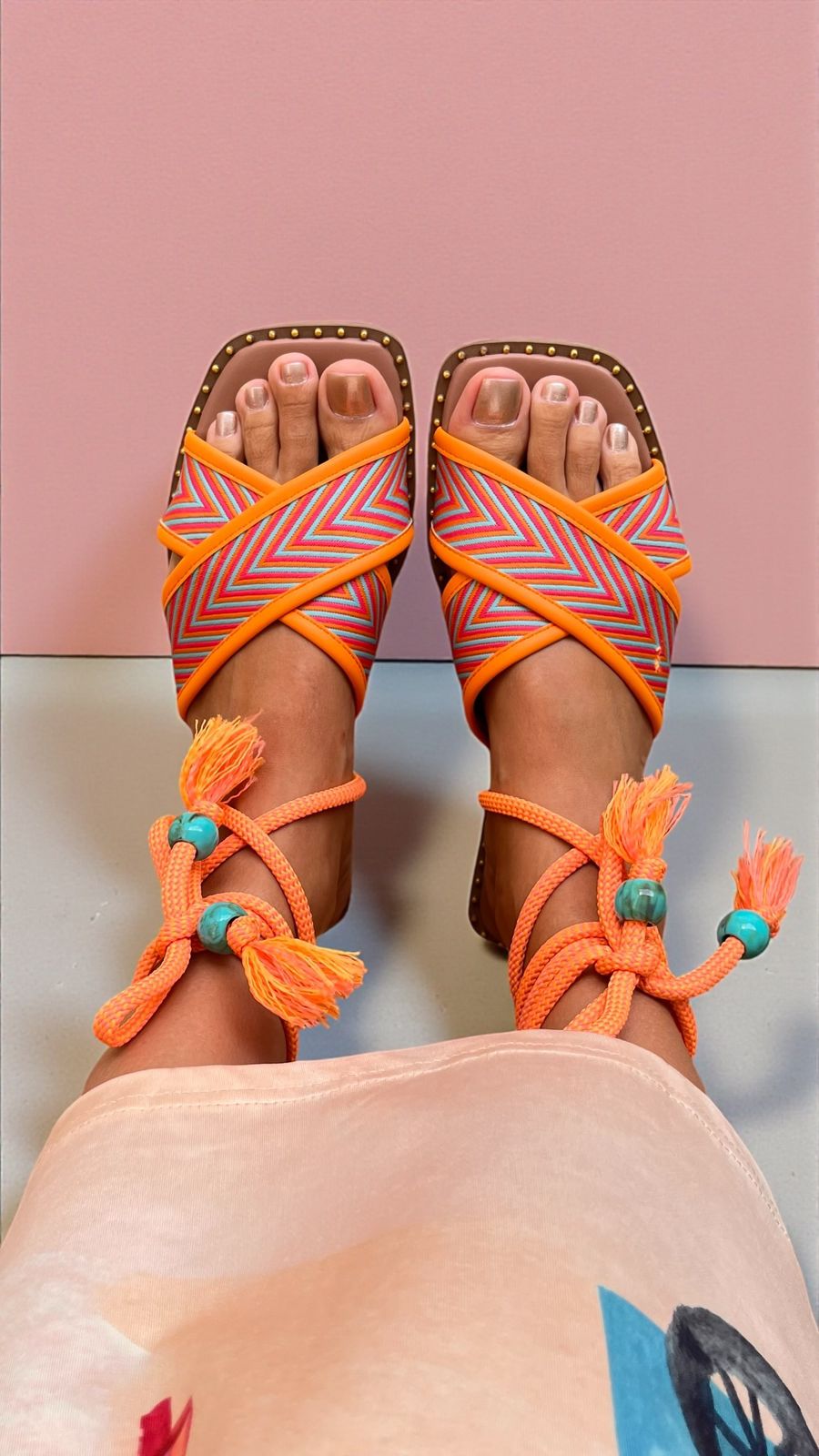 Rasteira bico quadrado com tira larga estampada e amarração em corda náutica e bolas nas pontas.