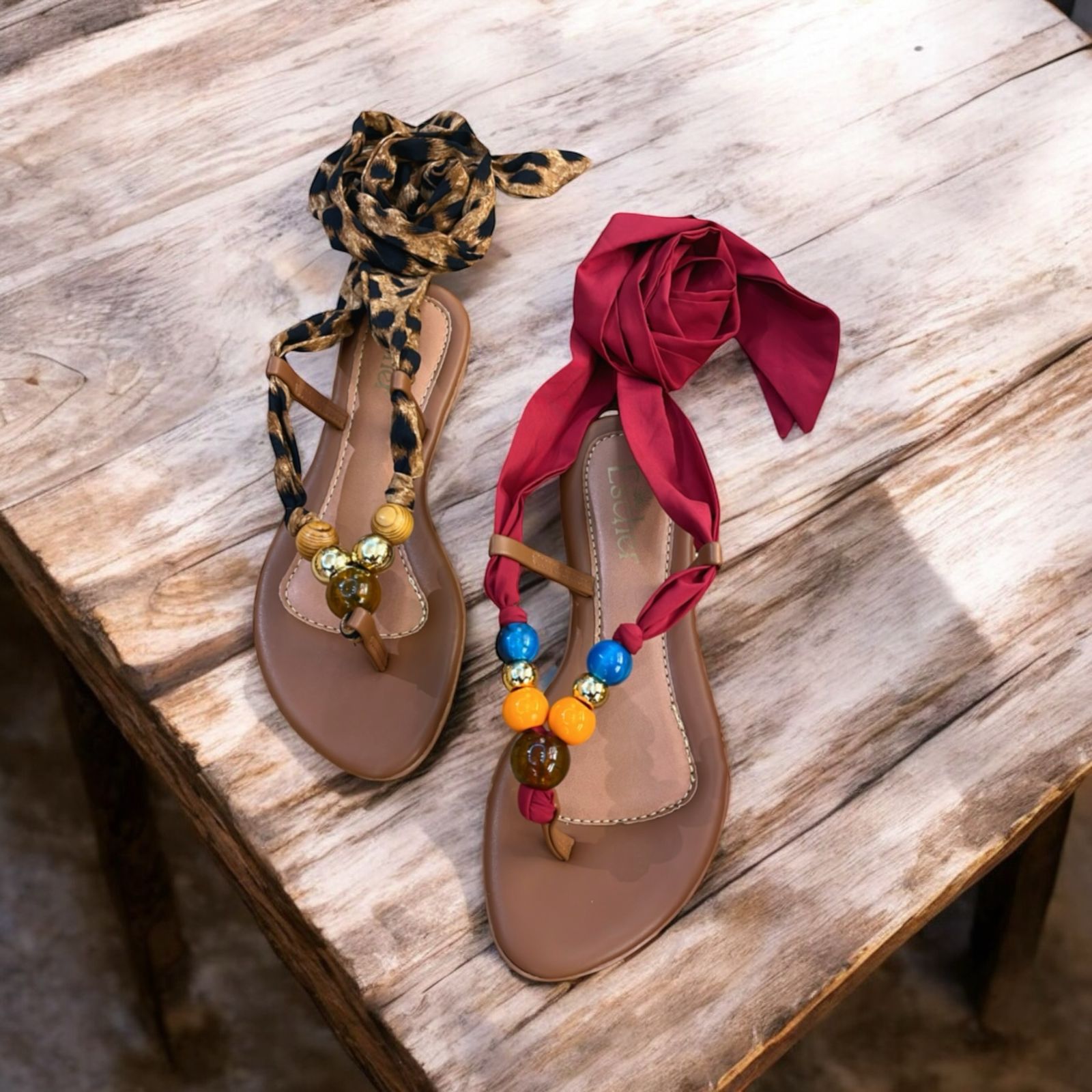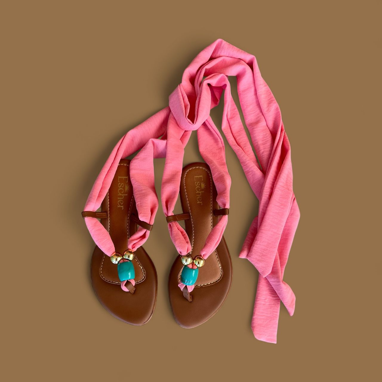 Rasteira bico redondo com palmilha em napa caramelo e amarração em tira de tecido com detalhes em bolas de acrílico.