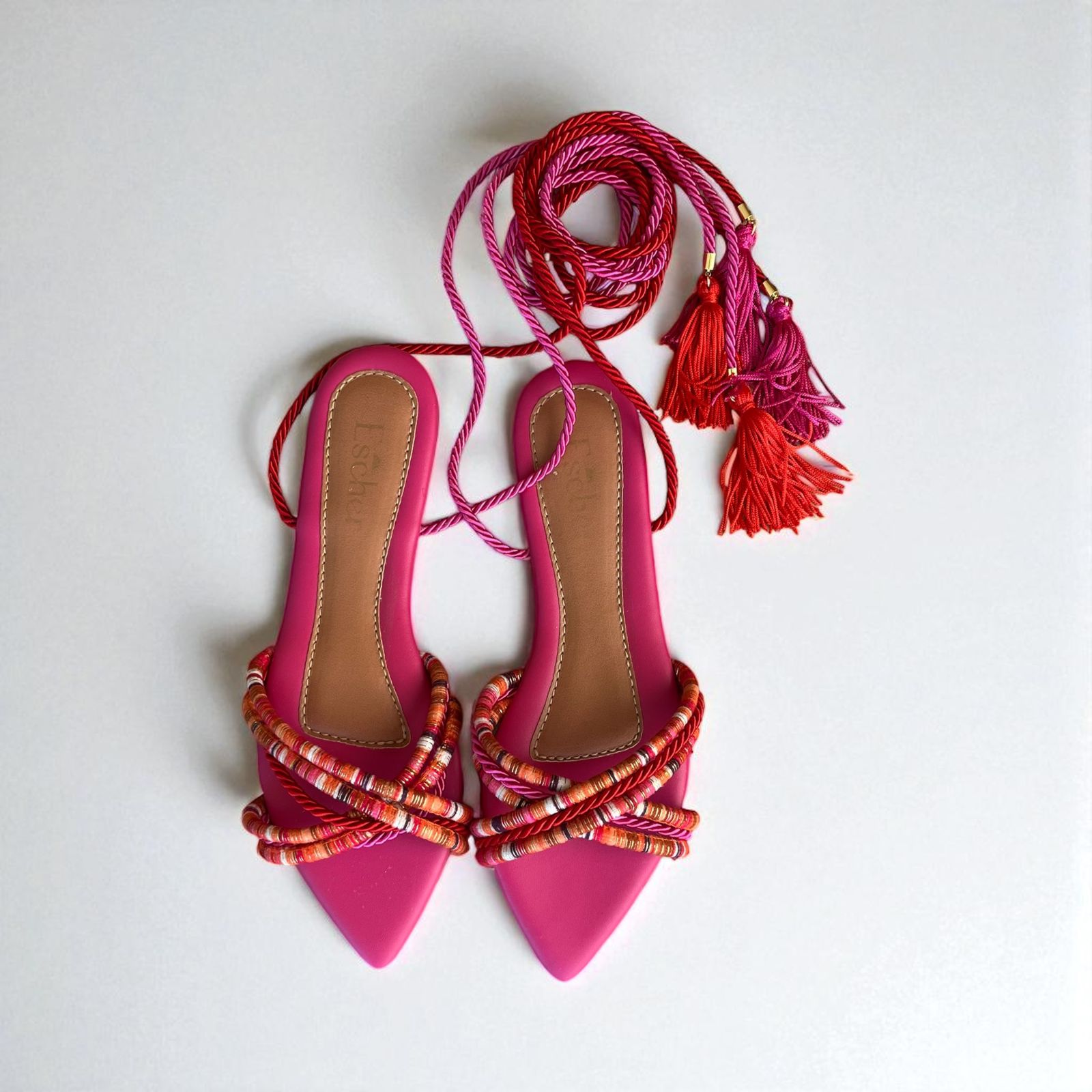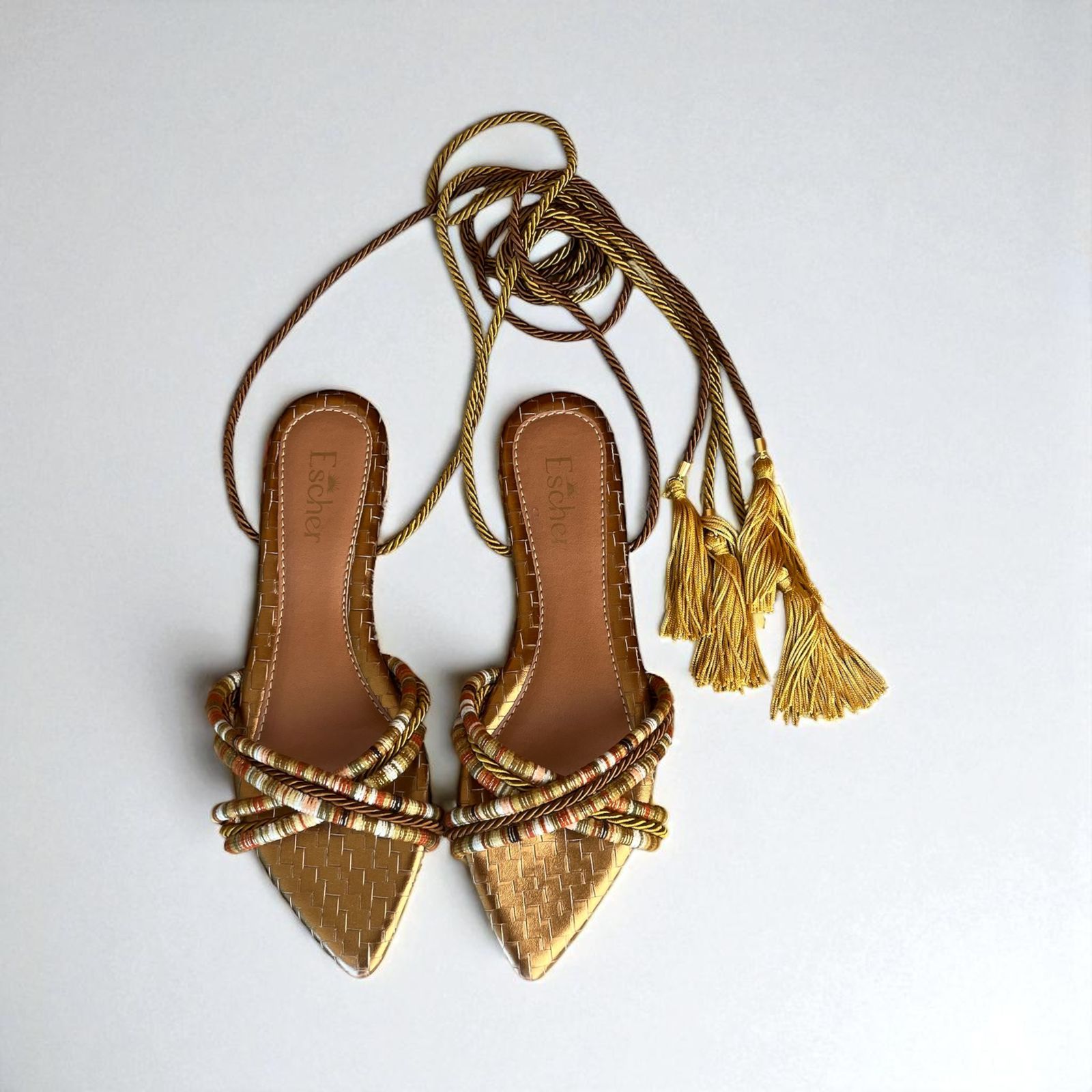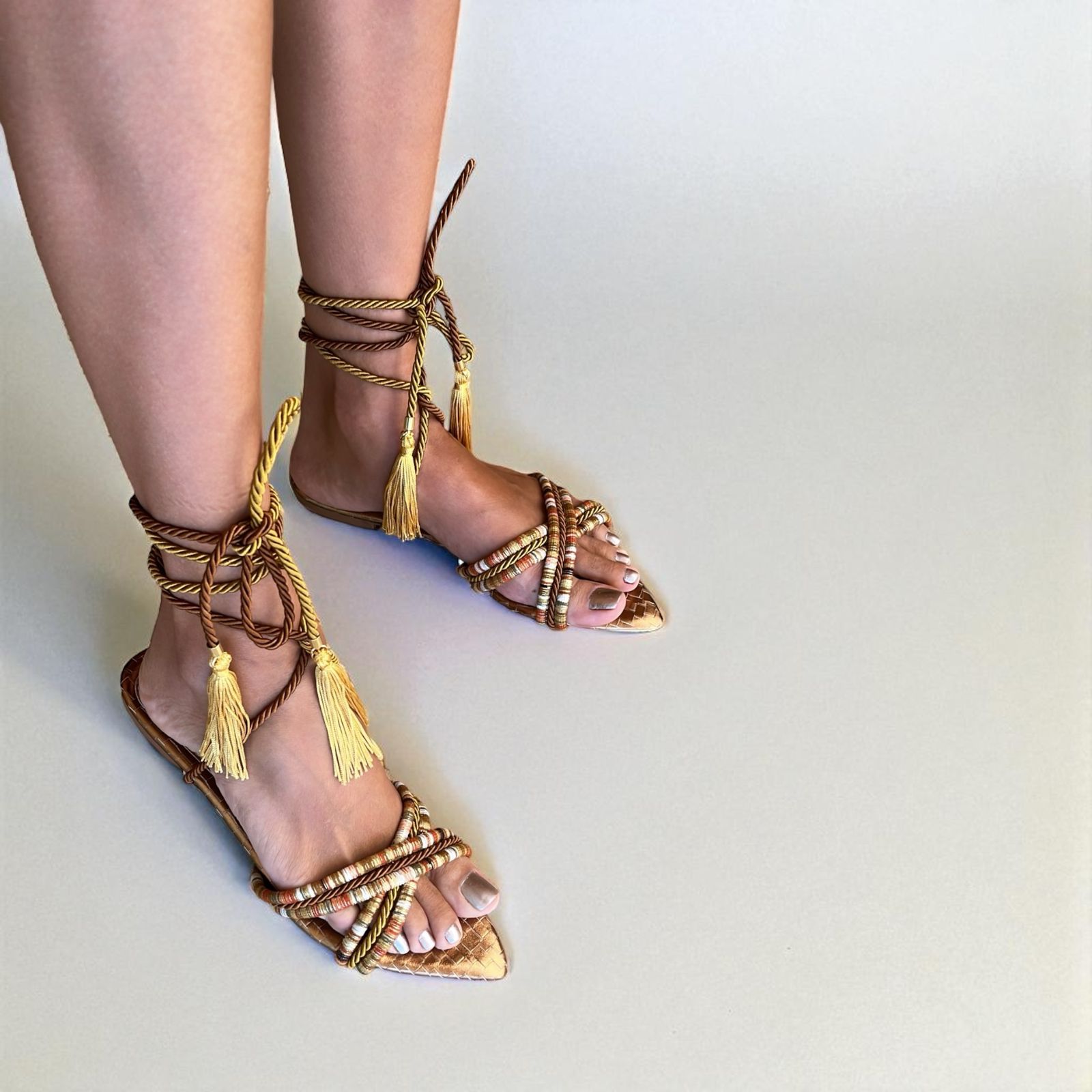 Rasteira bico folha com palmilha em napa e cabedal feito com cordão peruano estampado e cordão São Francisco.