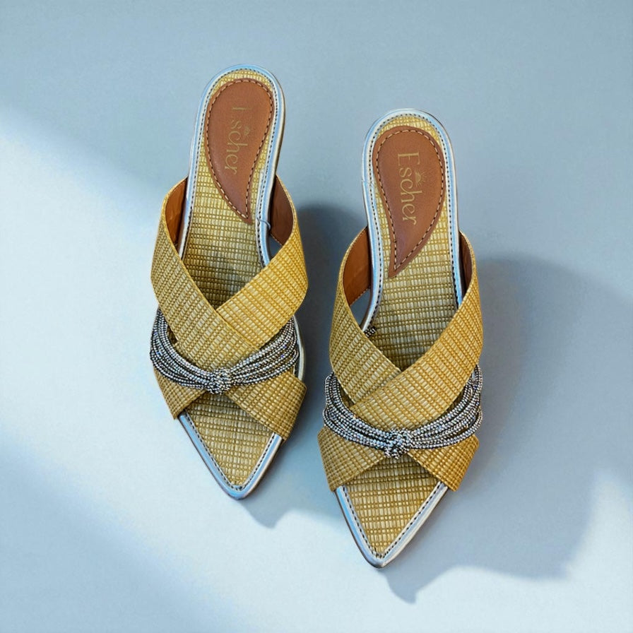 Rasteira bico folha com palmilha em material que remete a palha e detalhe em strass.