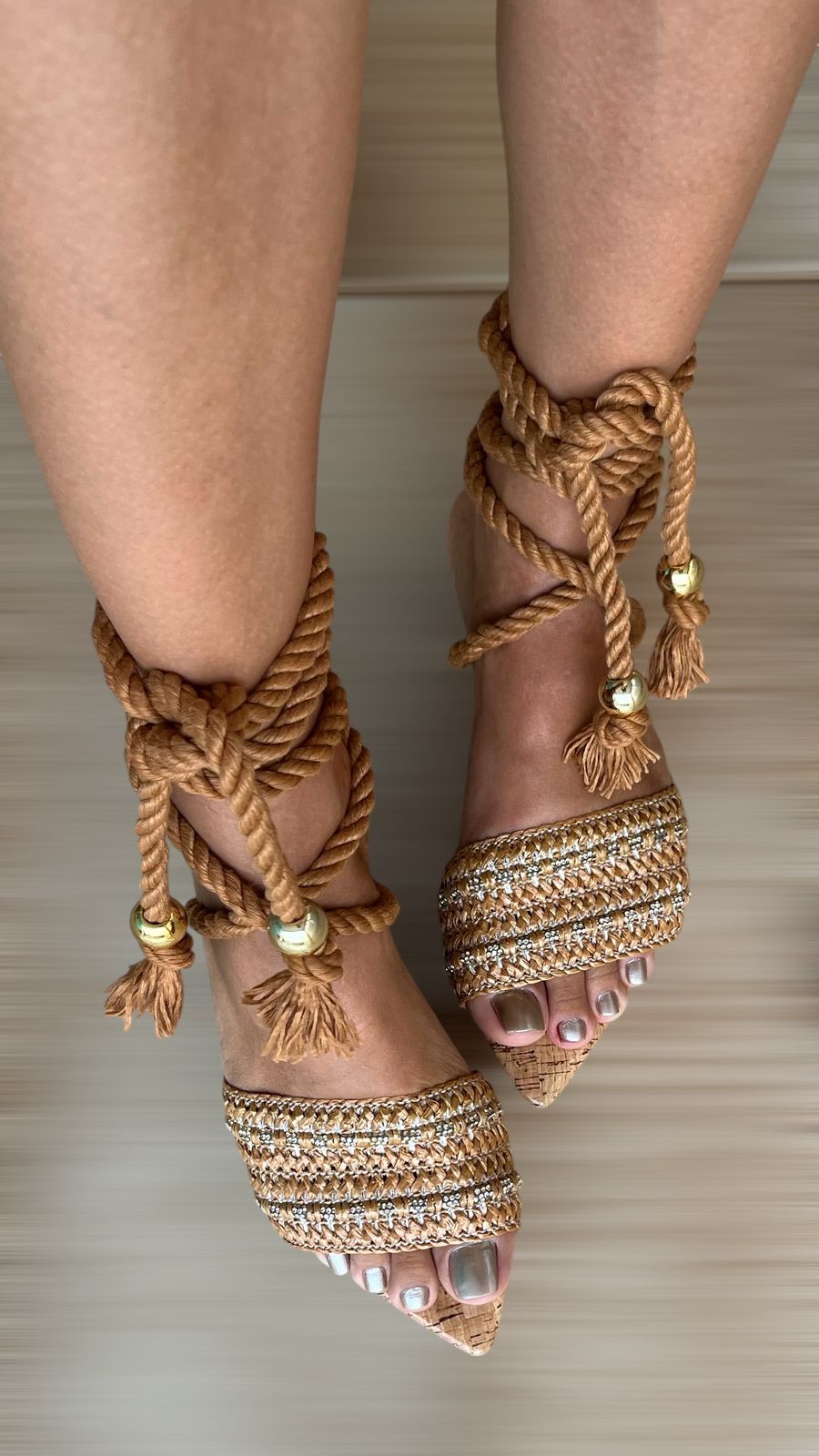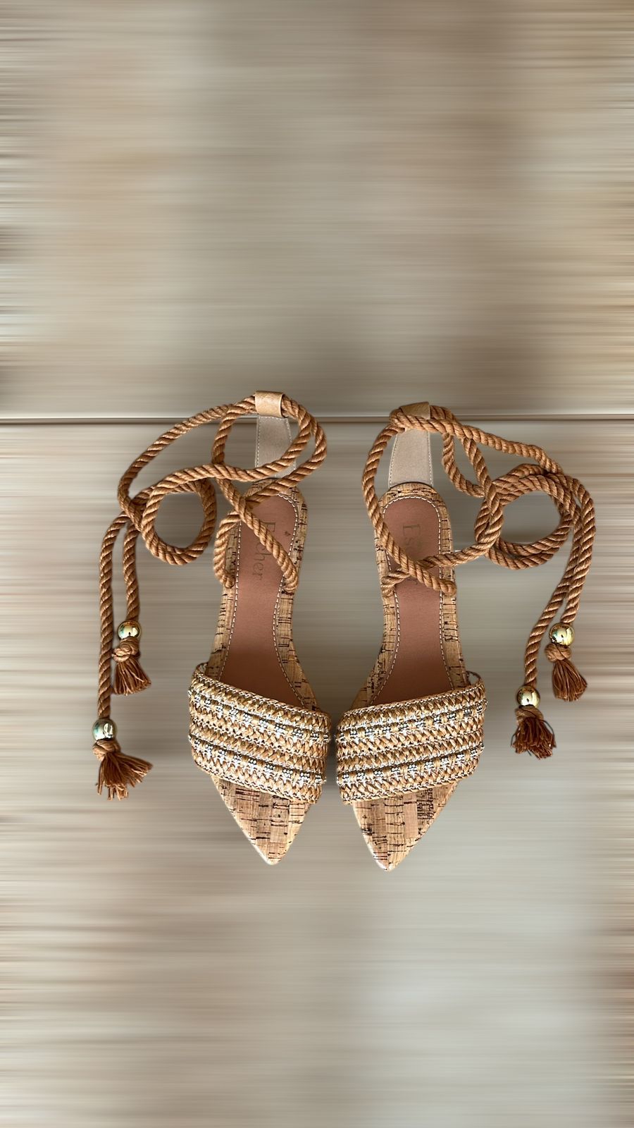 Rasteira com palmilha em cortiça vernizada ,cabedal em trança com strass e amarração em cordão 100% algodão!