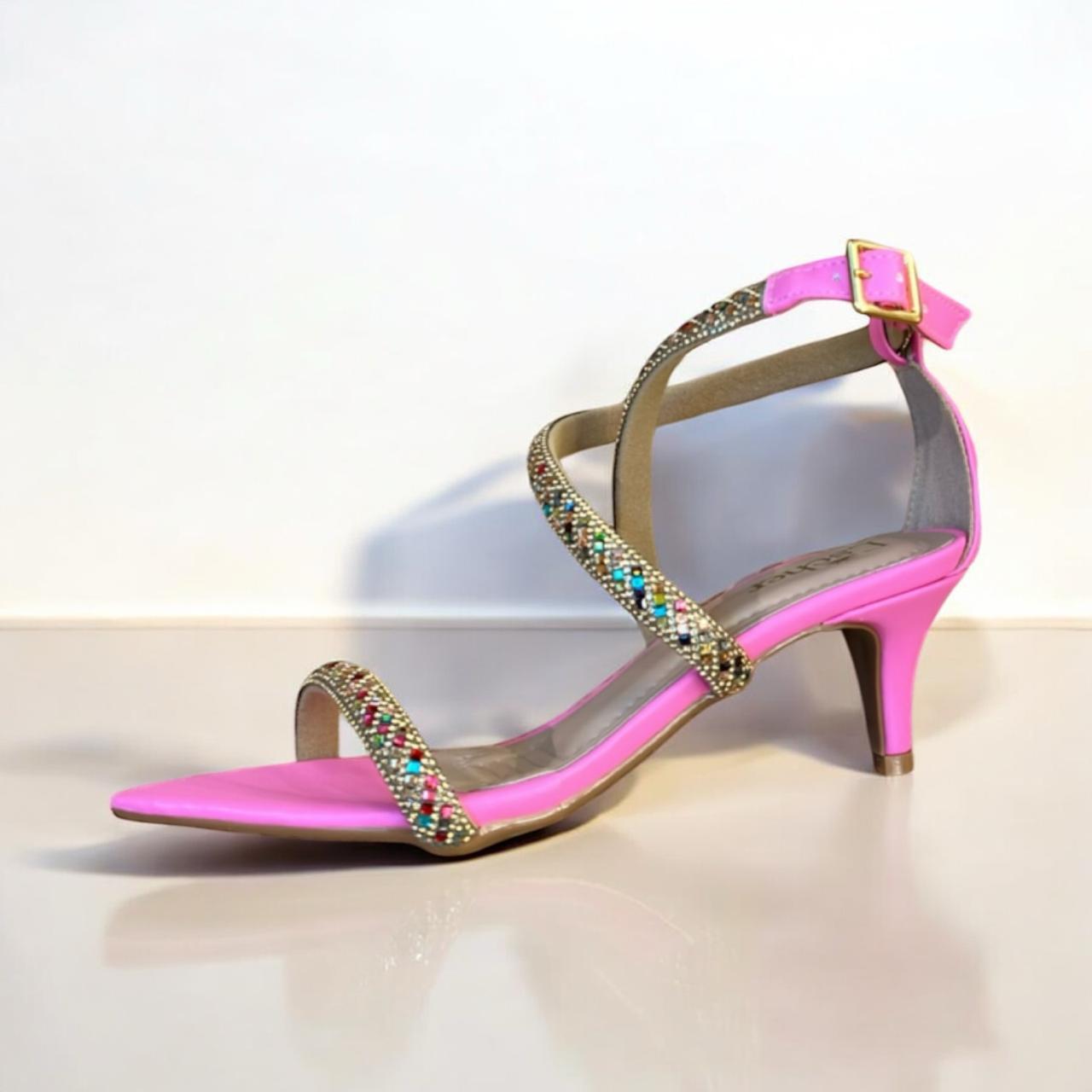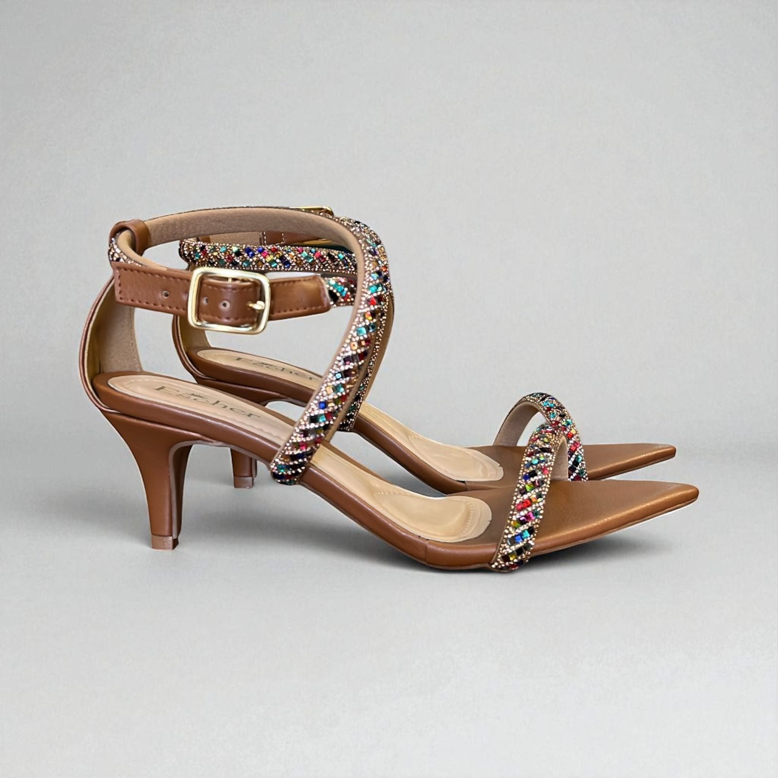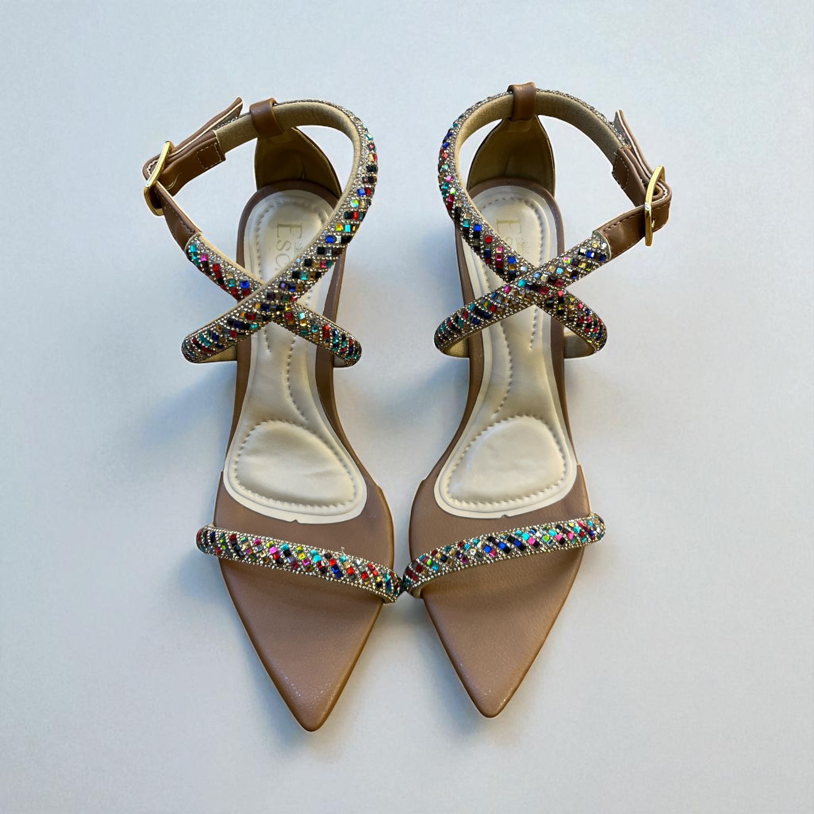 Salto bico folha altura 6 cm com cabedal feito em tira larga de strass colorido e palmilha em napa.