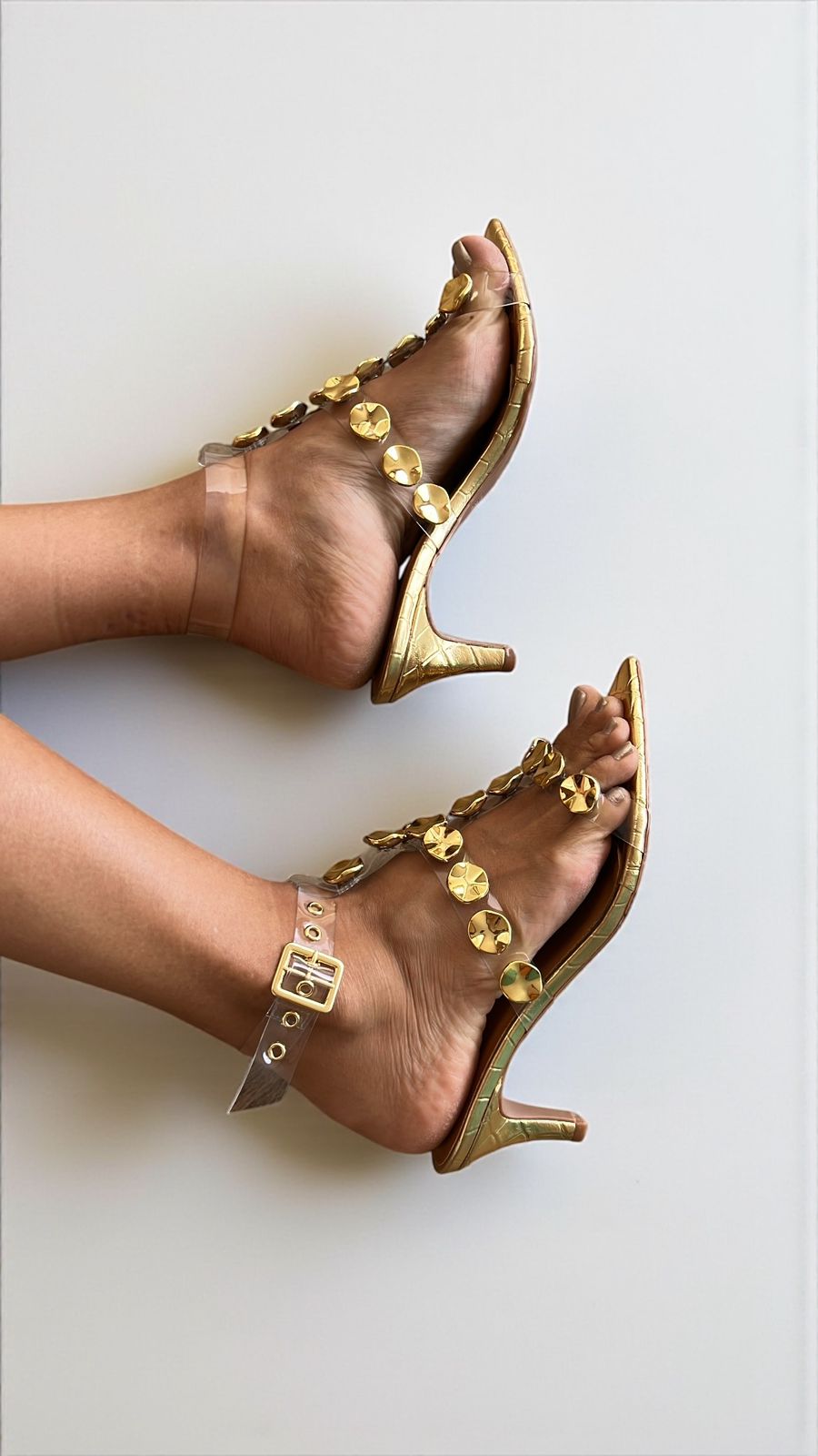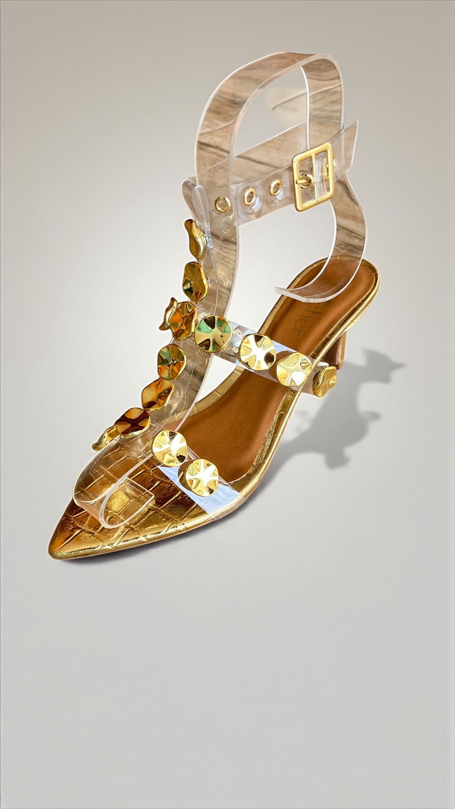 Salto fino em napa croco com cabedal em vinil e aplicações em acrílico dourado.
