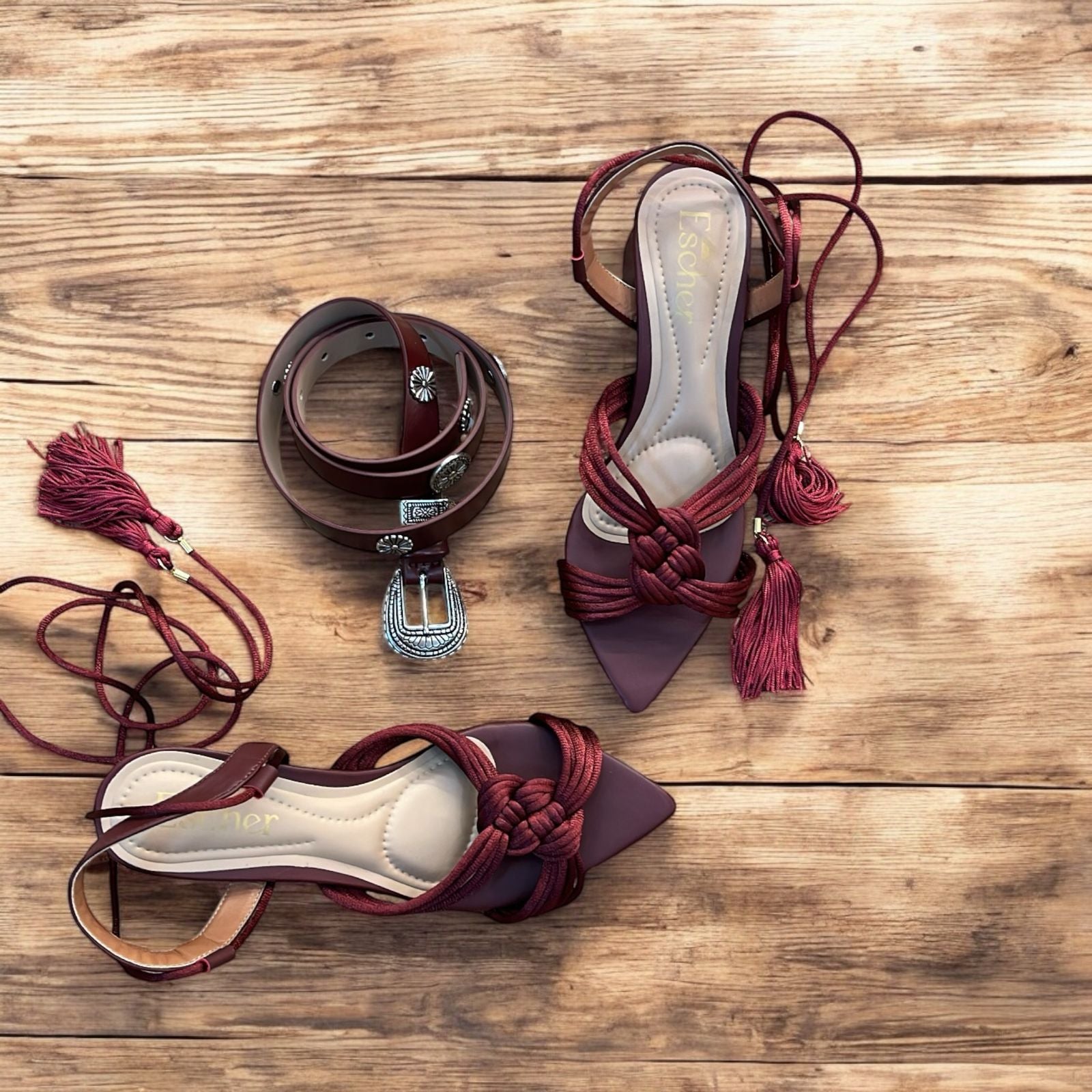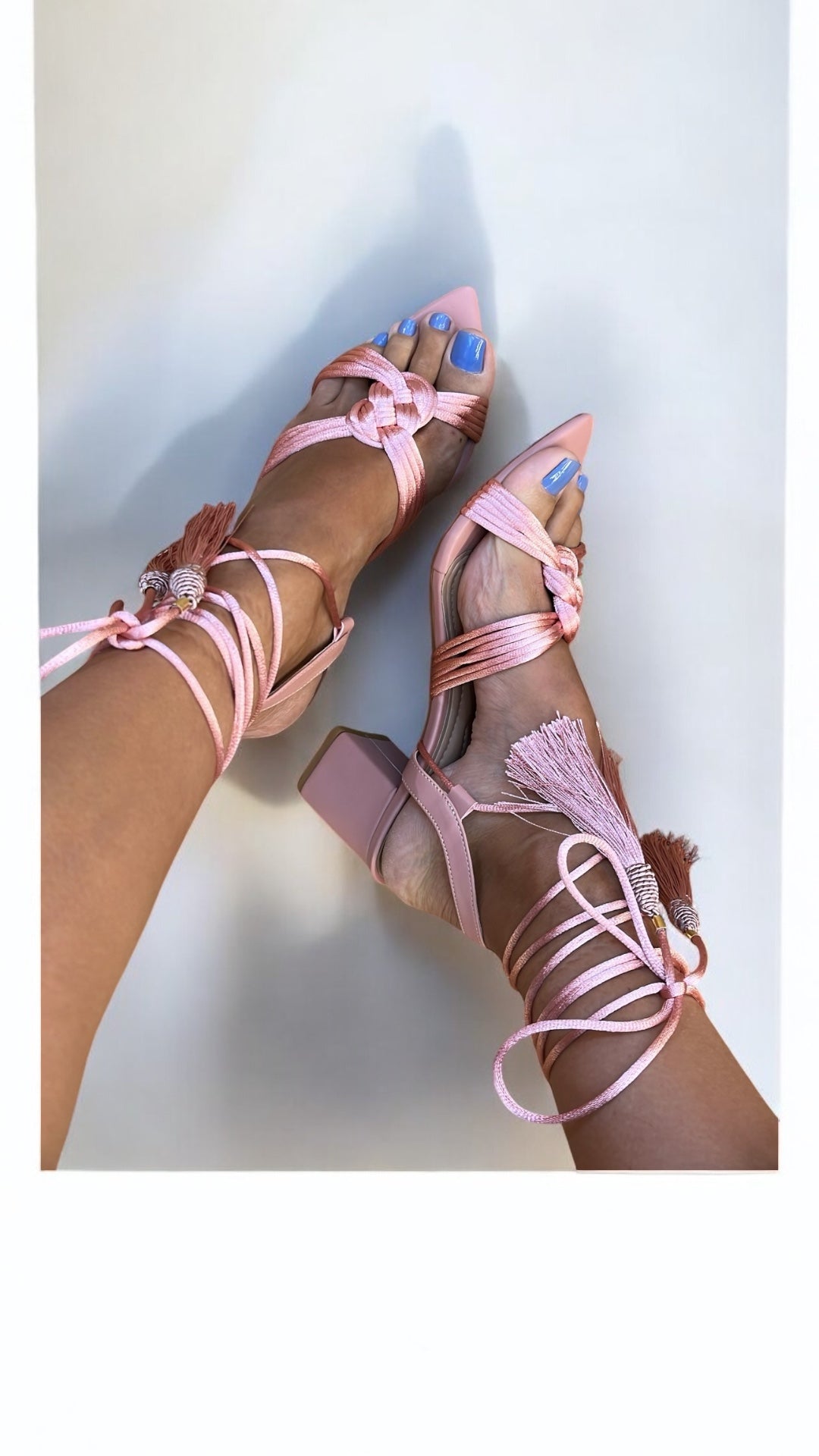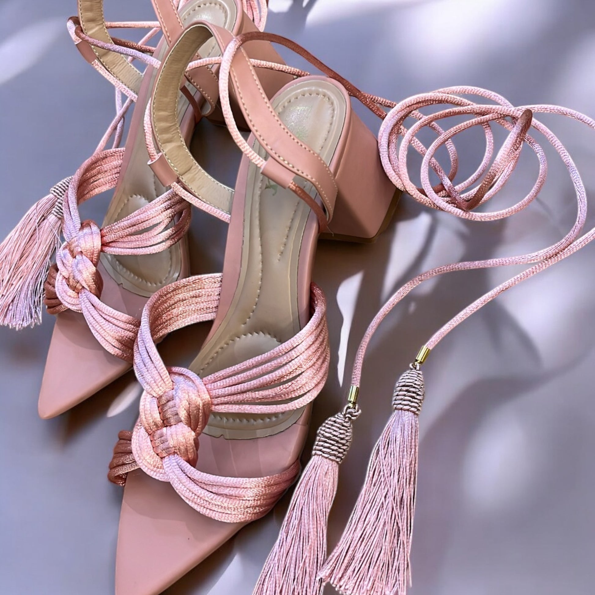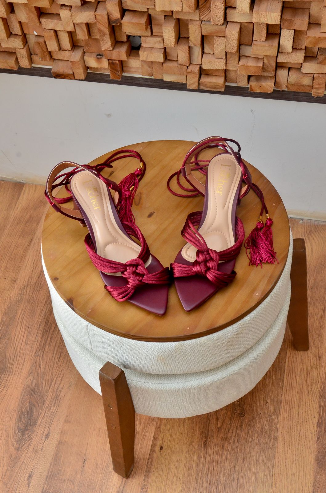 Salto bico folha com palmilha em napa ,cabedal feito a mão em cordão rabo de rato acetinado,com detalhes em tassel de seda nas extremidades !Peça artesanal e exclusiva da marca Escher !
