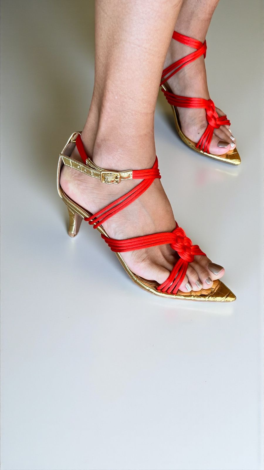 Salto bico folha me napa croco metalizada com cabedal feito em cordão rabo de rato acetinado.